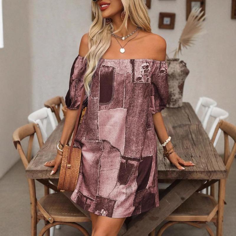 Весенне-летняя женская мода с принтом и цветными блоками, повседневное платье для отпуска на одно плечо с рукавами-фонариками M бордовый
