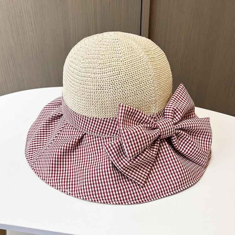 Весенне-летняя соломенная шляпа в клетку с бантом, большая солнцезащитная шляпа с карнизом, детская шляпа-ведро для отдыха на открытом воздухе M(56-58cm) розовый