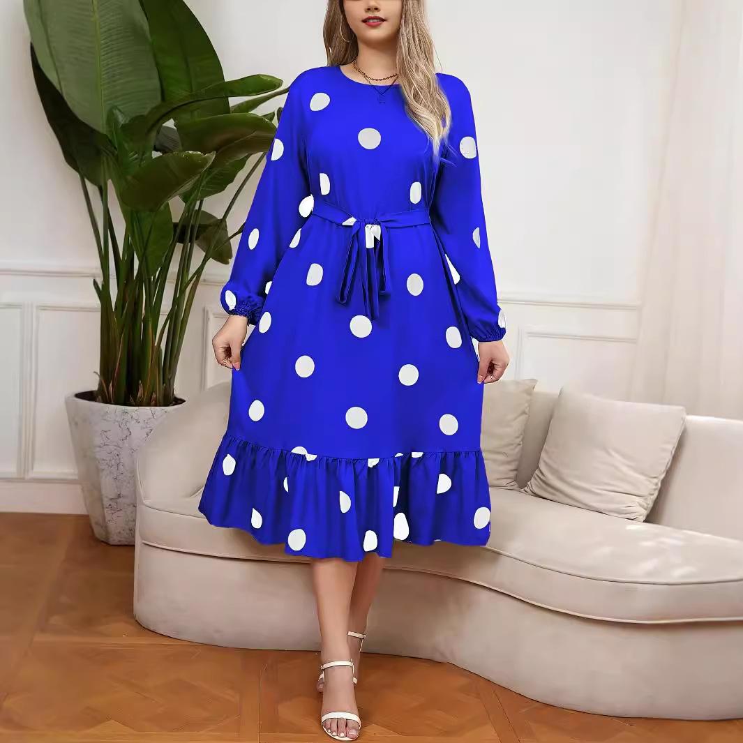 Весенне-осеннее женское облегающее платье больших размеров с длинным рукавом в горошек 4XL синий