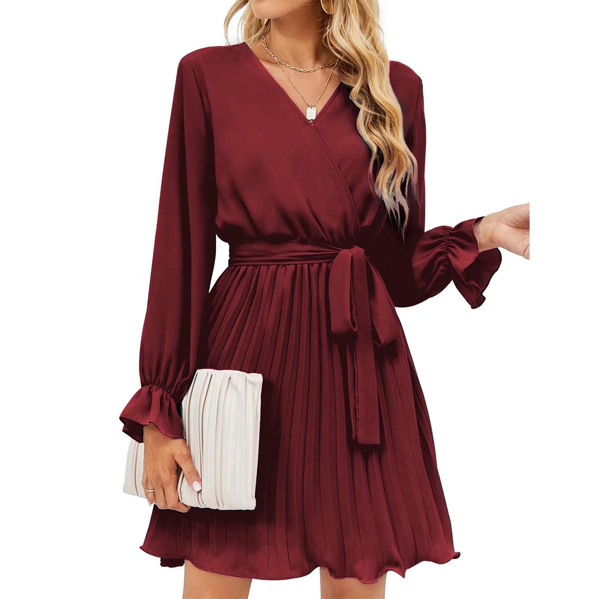 Весенне-осеннее женское платье с запахом и V-образным вырезом, повседневные плиссированные платья с длинным рукавом S бордовый