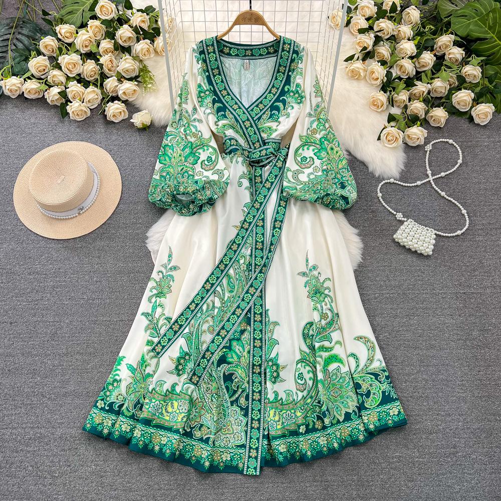Весенне-осеннее женское ретро-платье в стиле «фонарь» с длинными рукавами, V-образным вырезом, завязкой на талии и принтом «A Word Positioning» XL зелёный