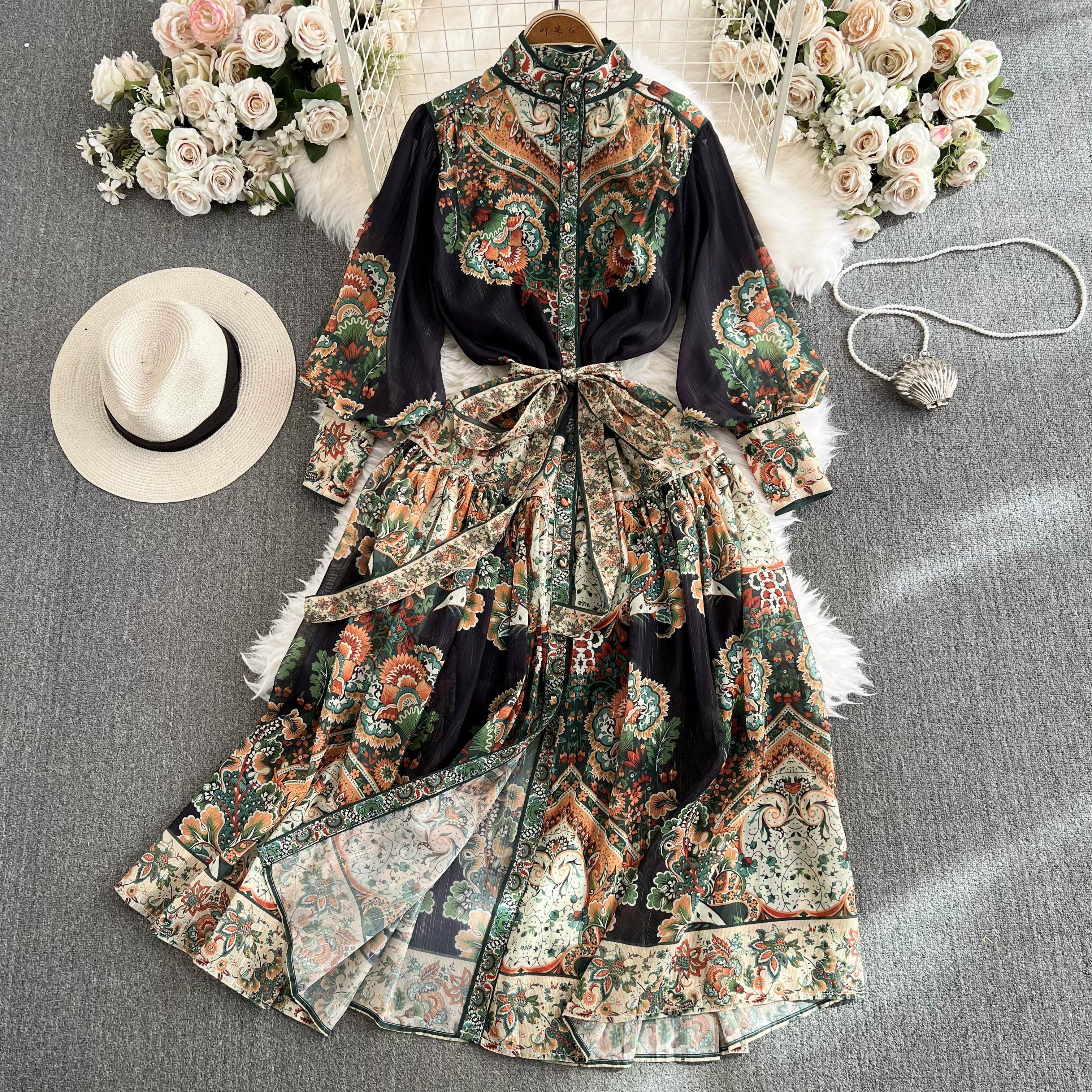 Весенне-осенние женские однобортные шифоновые платья с винтажным принтом на шнуровке, свободные праздничные пляжные платья большого размера XL чёрный