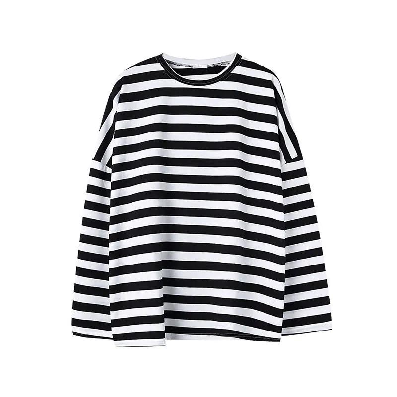 Весенне-осенние женские полосатые футболки в стиле Харадзюку, рубашки с круглым вырезом и длинными рукавами, Ulzzang, корейские повседневные черные топы большого размера XXL чёрный
