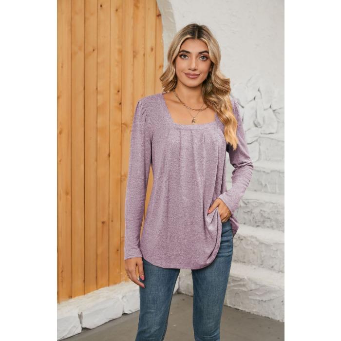 Весенне-осенняя женская блузка, плиссированный однотонный топ с квадратным вырезом и длинными рукавами XL светло-фиолетовый
