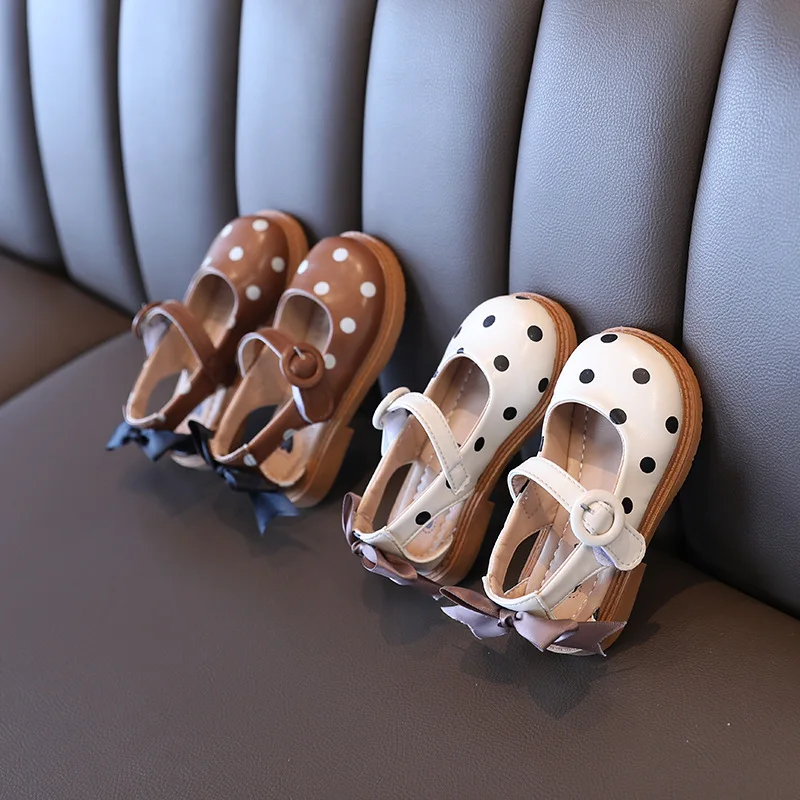 Весенне-осенняя новая детская модная обувь на плоской подошве, милые полые детские лоферы для школьников с бантом в горошек для девочек