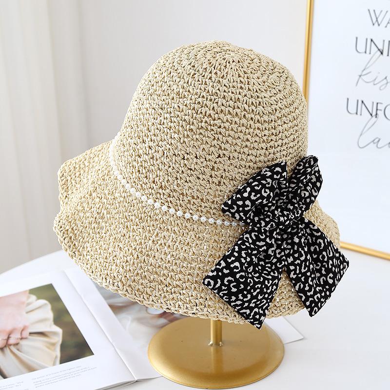 Весенние каникулы Бант Пятнистая соломенная шляпа Женская Новая Солнцезащитная Пляжная шляпа Adjustable бежевый