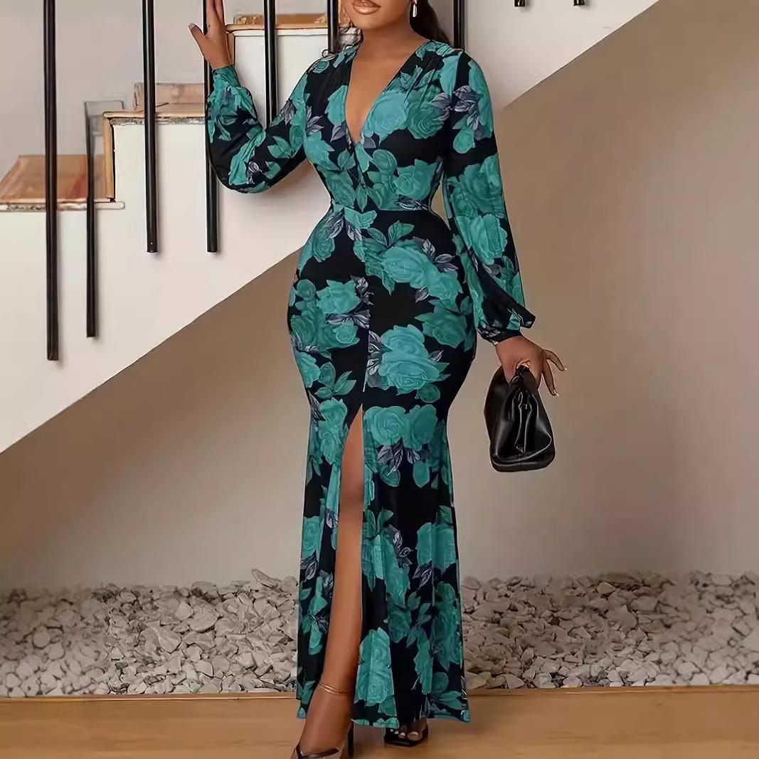 Весенние и осенние женские платья больших размеров с длинным рукавом и V-образным вырезом с разрезом и принтом 2XL зелёный