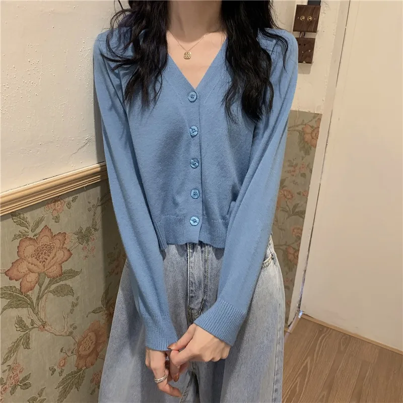Весенний тонкий кардиган с V-образным вырезом, свитер для женщин, новинка 2021, уличная одежда в Корейском стиле для похудения, короткий темпер...