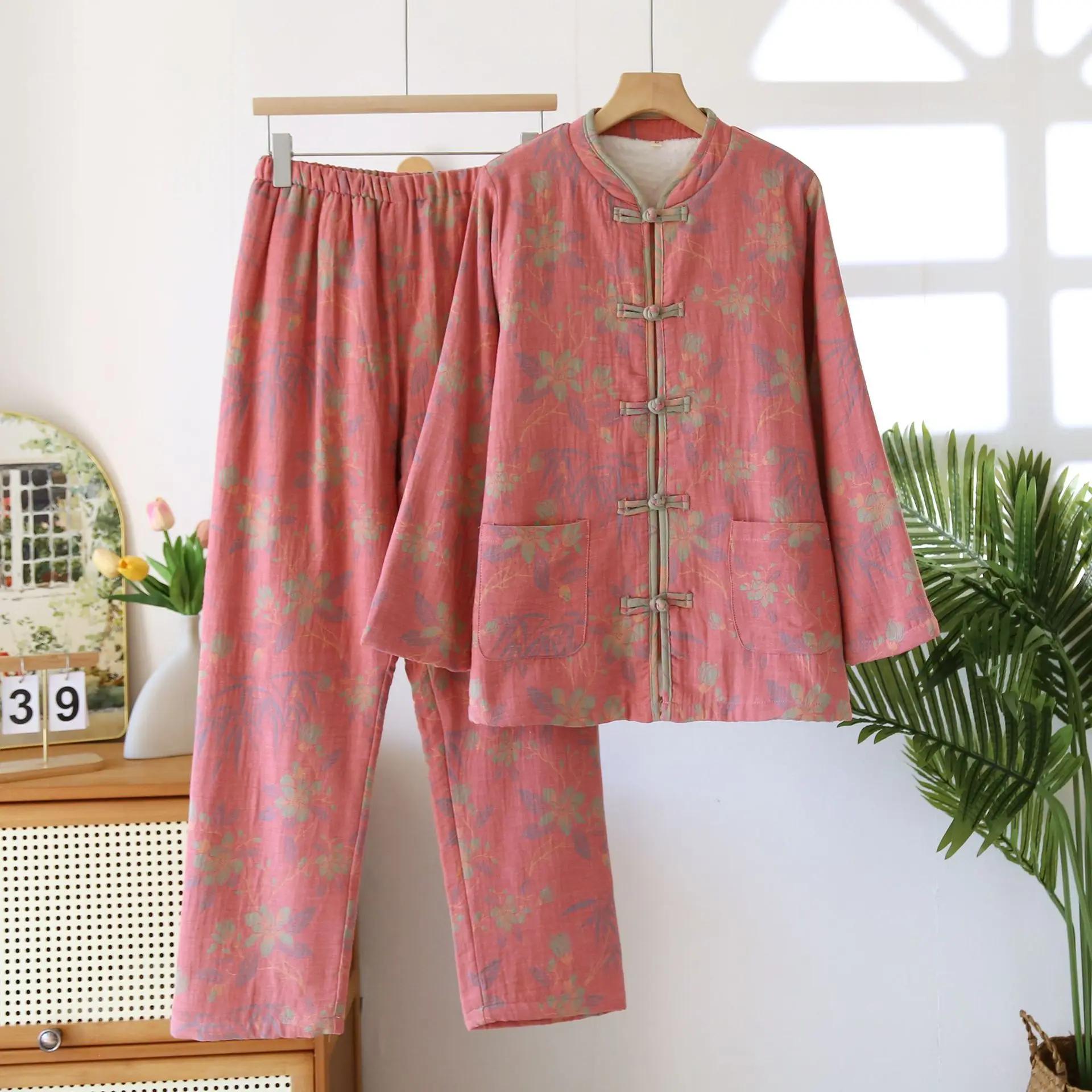 Весенняя двухслойная пряжа, окрашенная в пряже, женские брюки с длинными рукавами, домашняя одежда, жаккард, хлопок + фланель, пижама, 2 предмета XL красный