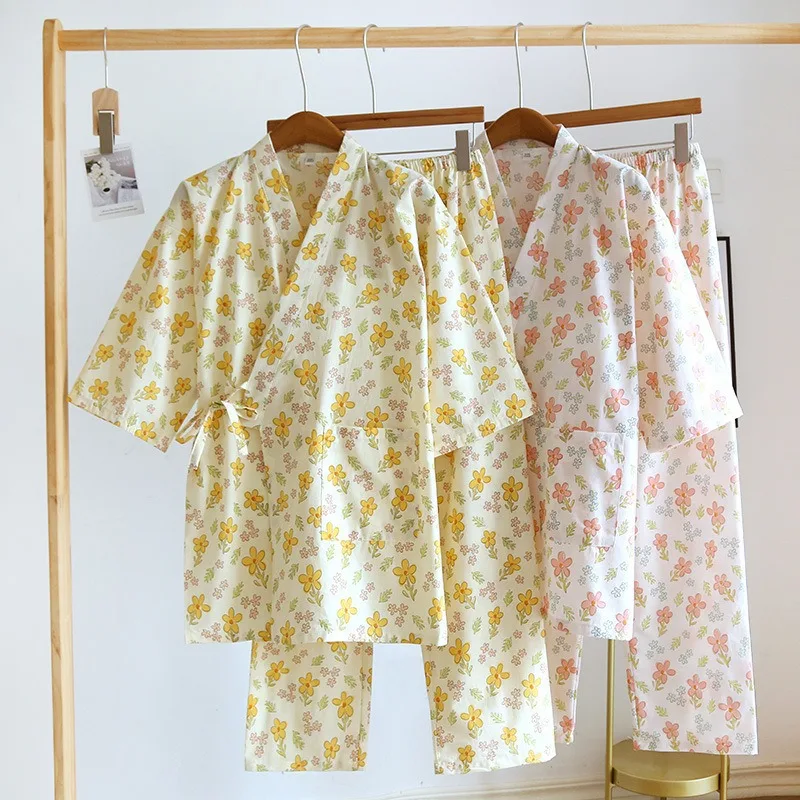 Весенняя женская Хлопковая пижама, женская одежда для сна с рукавом 7, V-образным вырезом, пижама с цветочным принтом, комплект из 2 предметов, домашняя одежда для сна