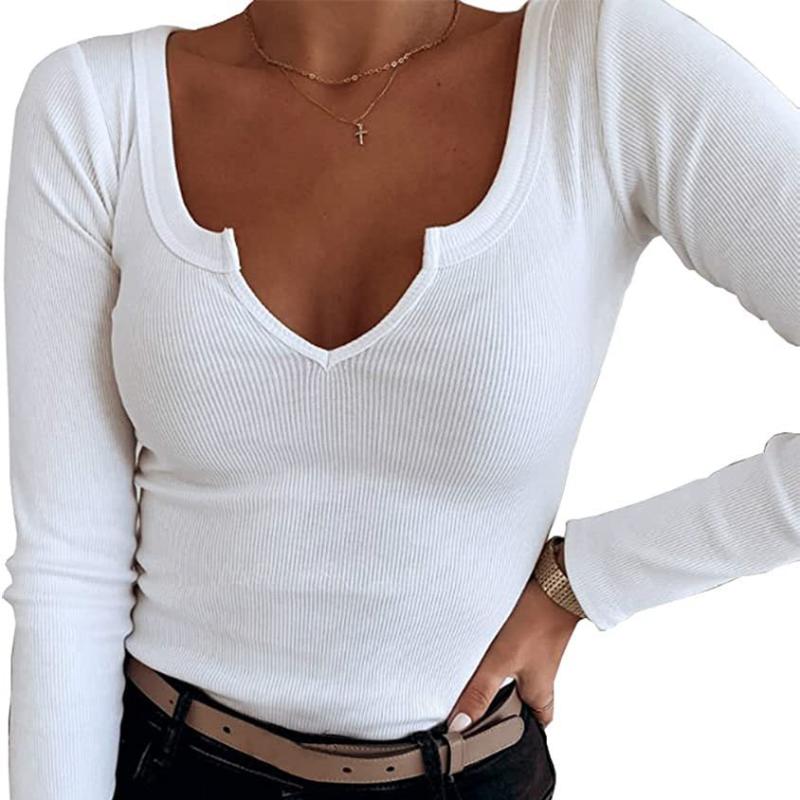 Весенняя новинка однотонная полосатая глубокая U-образная горловина с длинным рукавом сексуальная повседневная футболка топы S-XL XL белый