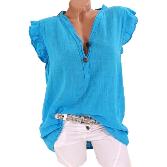 Весенняя рубашка в стиле ретро, женская повседневная рубашка с v-образным вырезом и пуговицами, с коротким рукавом, однотонная хлопковая блузка размера плюс XXL небесно-голубой