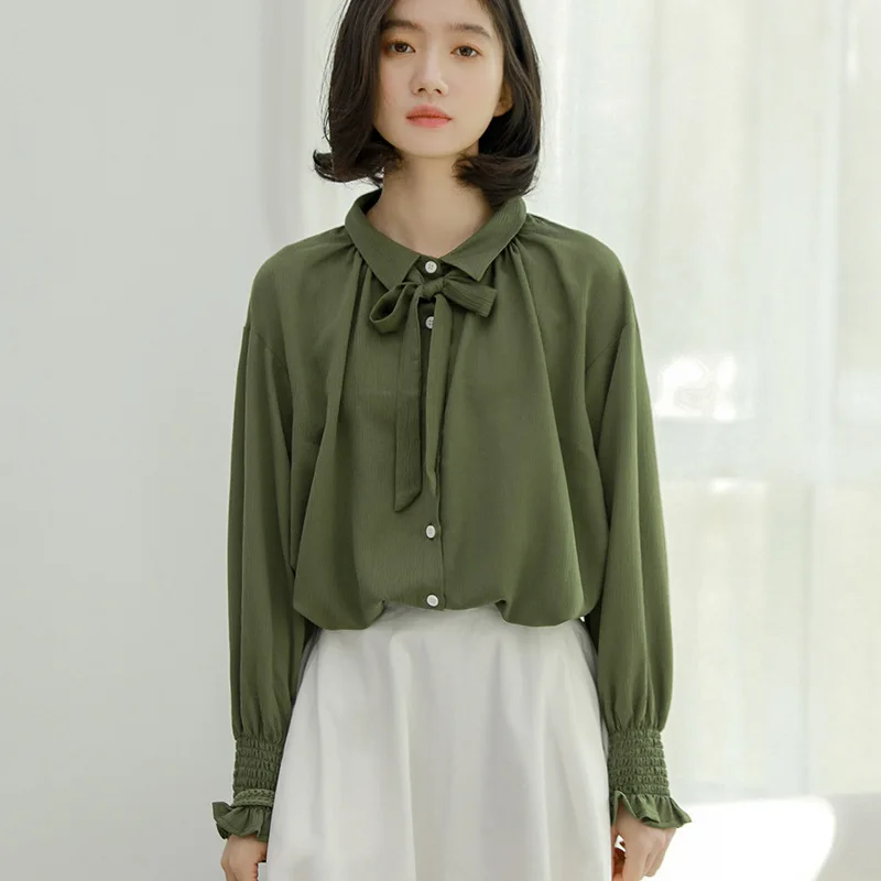 Весенняя шифоновая рубашка Для женщин зеленого цвета с отложным воротником с длинным рукавом Свободная блузка для девочек Женская, одноцветная бантом темперамент джемпер свободного покроя H9167