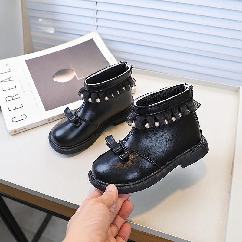 Весна Осень Девочки Модные Бежевые Ботильоны Милые Детские Ботинки Лолиты Кожаные Ботинки Повседневные Универсальные Ботинки Принцессы с Бантом 26 чёрный