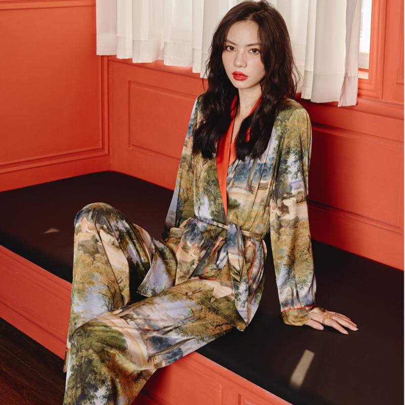Весна Осень Женская Пижама Шелковый Атлас Домашняя Одежда Короткие Печатные Халаты Длинные Рукава Подружки Невесты Свадебная Вечеринка Пижамный Комплект Одежда Для Сна XL