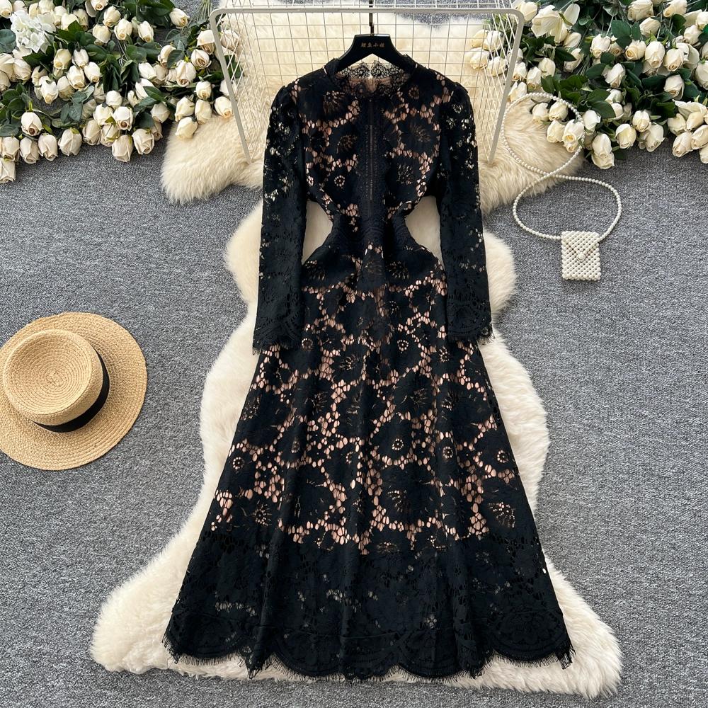 Весна Осень Женские Винтажные Платья Миди с Длинным Рукавом и Кружевом с Ажурным Узором для Вечеринки XXL чёрный