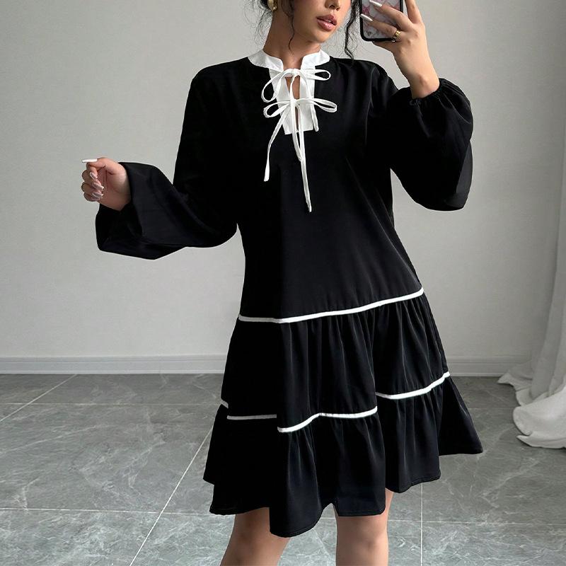 Весна Осень Женское Новое Платье Мода Темперамент Цветной Блок V-образный вырез Фонарики Рукава Бантом Свободные Высокая Талия А-силуэта Короткие Платья M