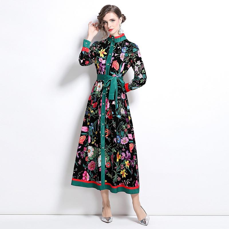 Весна Осень Женское Стоячий Воротник Винтаж Дворцовый Принт Дизайнерское Подиумное Платье Однобортное Длинное Макси Оверсайз Свободные Платья Для Вечеринок На Шнуровке 2XL чёрный