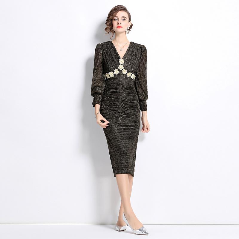 Весна Осень Женское Элегантное V-образным вырезом 3D Цветочная Складка Тонкий Облегающий Офис Работа Вечеринка Карандаш Платье 3XL