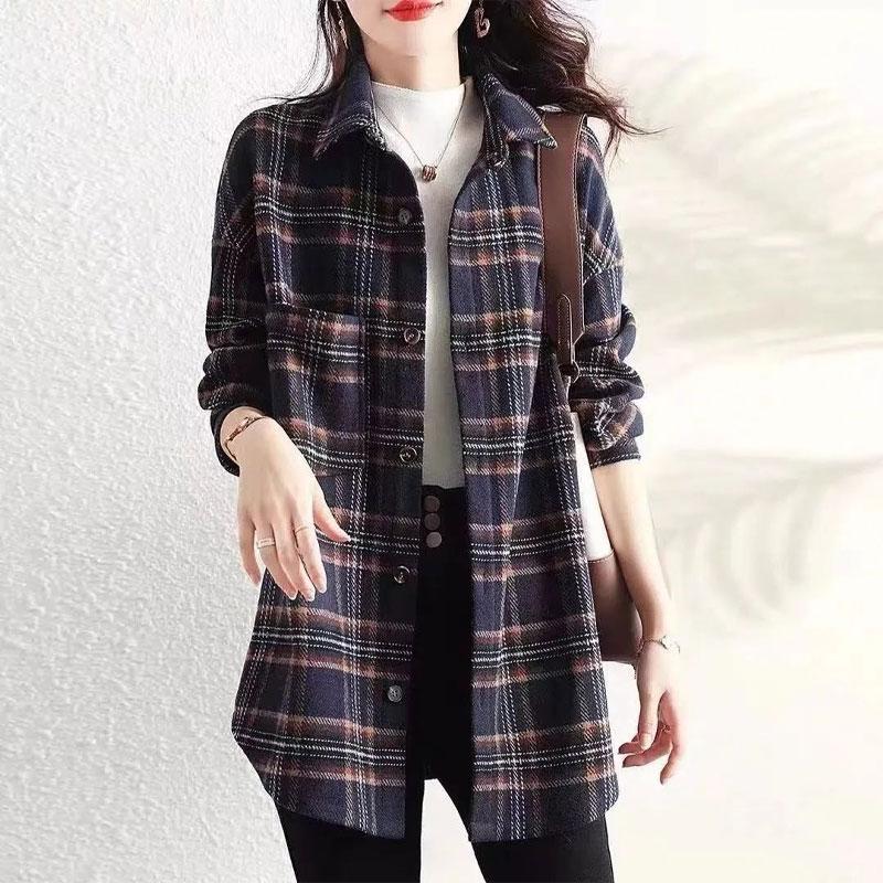 Весна Осень Корейская Клетчатая Свободная Блузка Для Поездок Однобортная Женская Одежда Отложной Воротник Повседневная Карманы Составная Рубашка 6XL