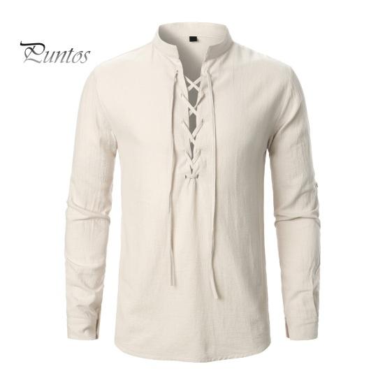 Весна Осень Мужская Рубашка На Шнуровке Воротник-стойка Длинные Рукава С Запонками Однотонный Свободный Ретро Средневековый Средневековый Средневековый Топ Средней Длины Повседневный Офисный Топ S хаки