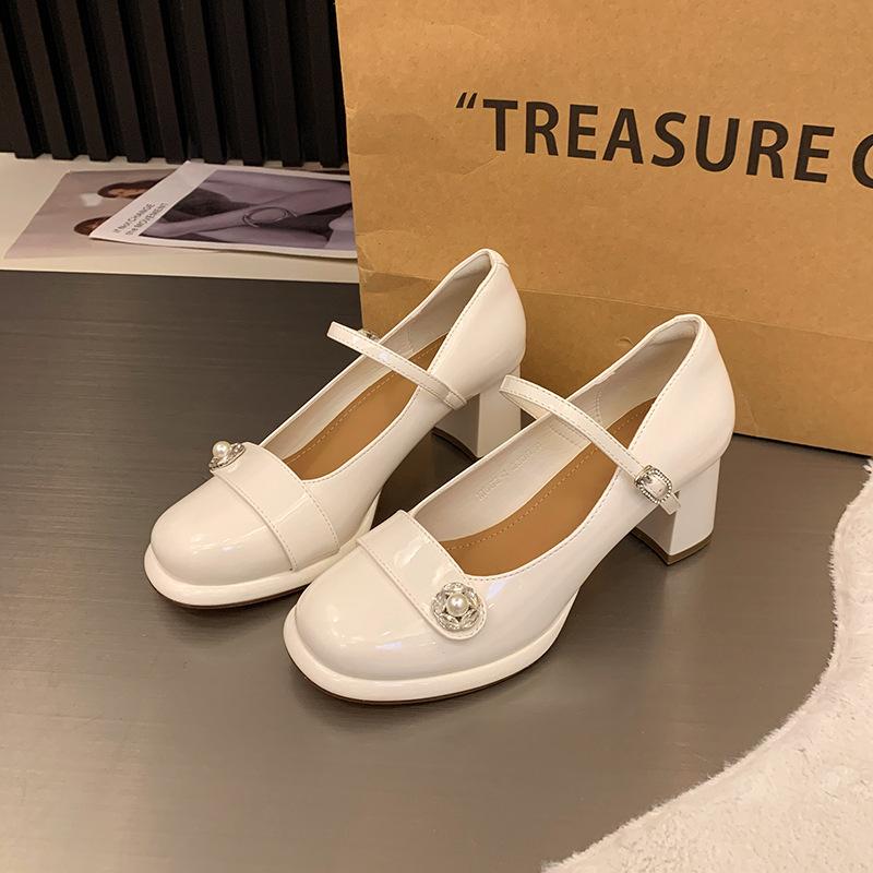 Весна и Осень Новые Мэри Джейн 2024 Обувь на Толстом Каблуке и Высоком Каблуке Темперамент Жемчуг Ретро Круглый Носок Детская Универсальная Одинарная Обувь 39