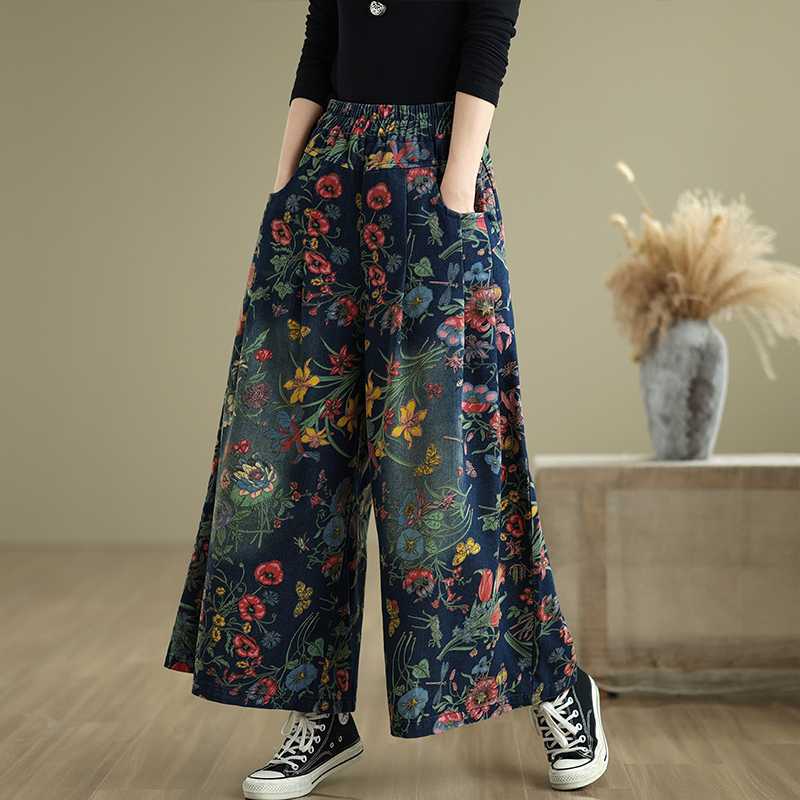 Весна Осень Плюс Размер Женские Цветочные Принты Джинсы Высокая Талия Цветные Свободные Джинсовые Брюки Винтажные Мешковатые Широкие Брюки с Карманами XXL синий