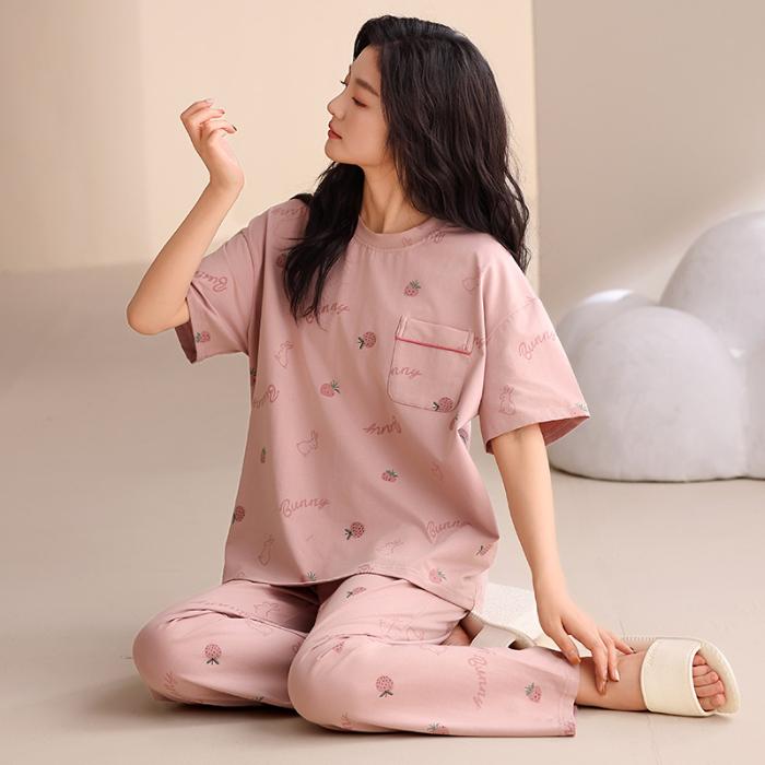 Весна-лето Тонкий хлопковый пижамный комплект для женщин Синий мультяшный принт Топы с короткими рукавами и длинные брюки Пижамы женские Повседневная пижама Домашняя одежда XXL