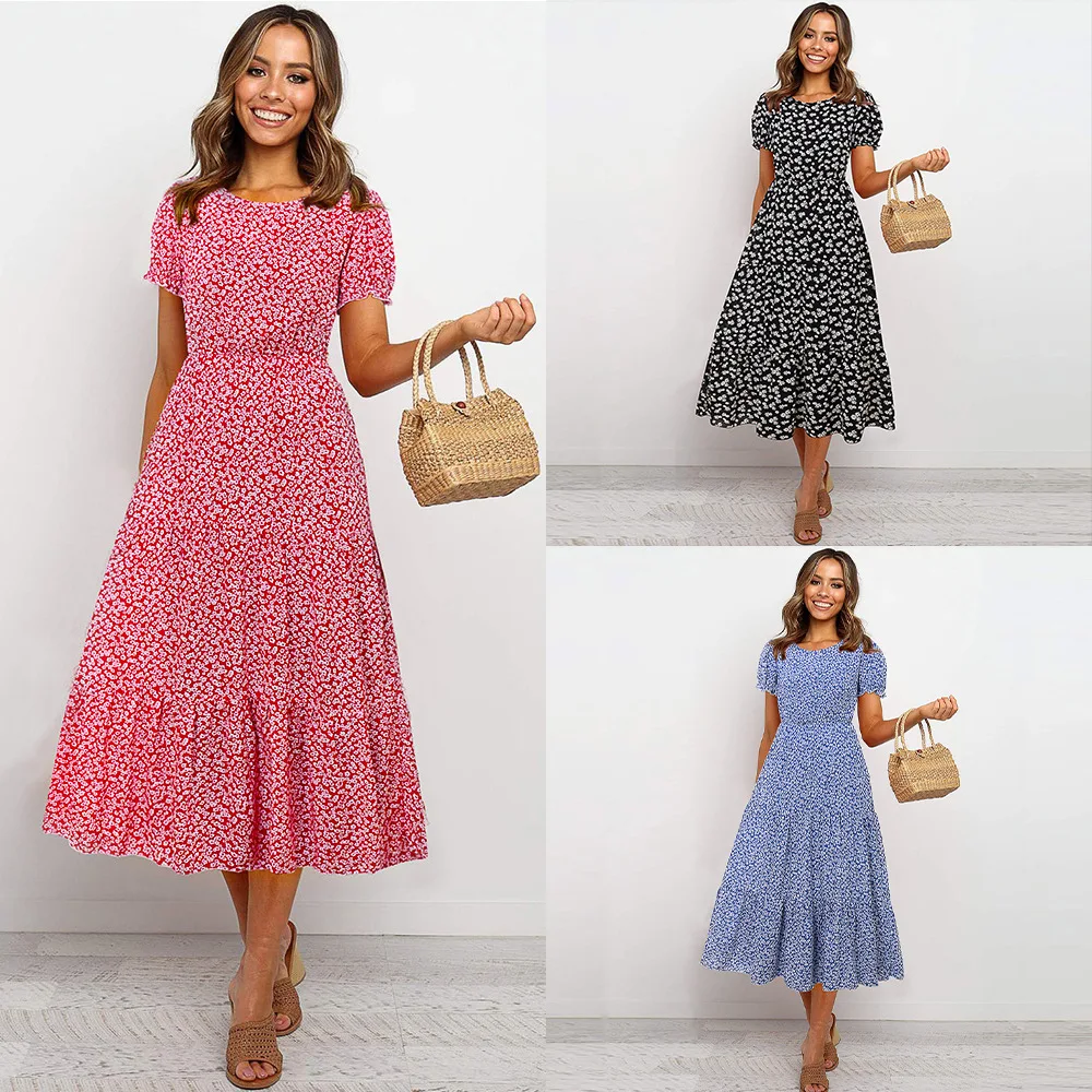 Весна-лето 2020, женское платье с круглым вырезом и рукавами-фонариками, цветочное длинное платье с высокой талией