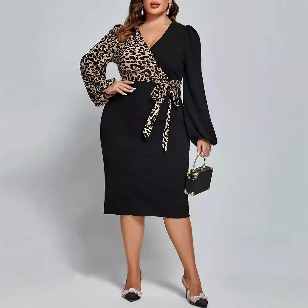 Весна и осень Большие размеры Женские платья Сексуальные платья с леопардовым принтом и V-образным вырезом в стиле колор-блок 4XL чёрный