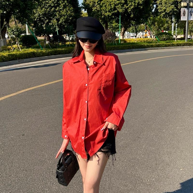 Весна-осень, женская офисная рубашка с длинными рукавами, новая модная однобортная тонкая блузка больших размеров, женская элегантная однотонная свободная повседневная простая блузка 3608 4XL арбуз красный