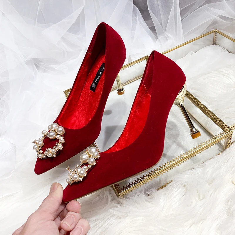 Весна 2022, заостренный тонкий каблук, украшение из жемчуга для девочек, повседневный высокий каблук KP2690