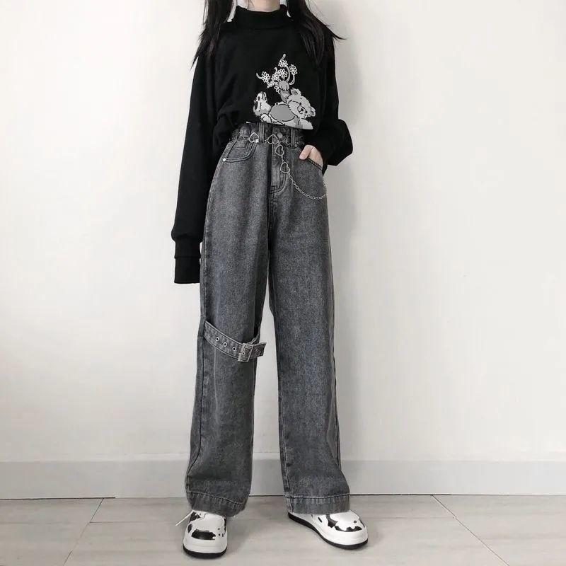 Весна 2022, модные женские джинсы с высокой талией, женские широкие джинсы, мешковатые женские джинсовые капри, прямые брюки, джинсовые брюки для мамы S черный серый