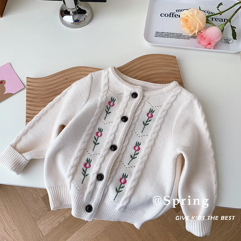 Весна 2023, вязаные свитера с цветочной вышивкой для девочек, детский вязаный Топ с длинным рукавом для малышей