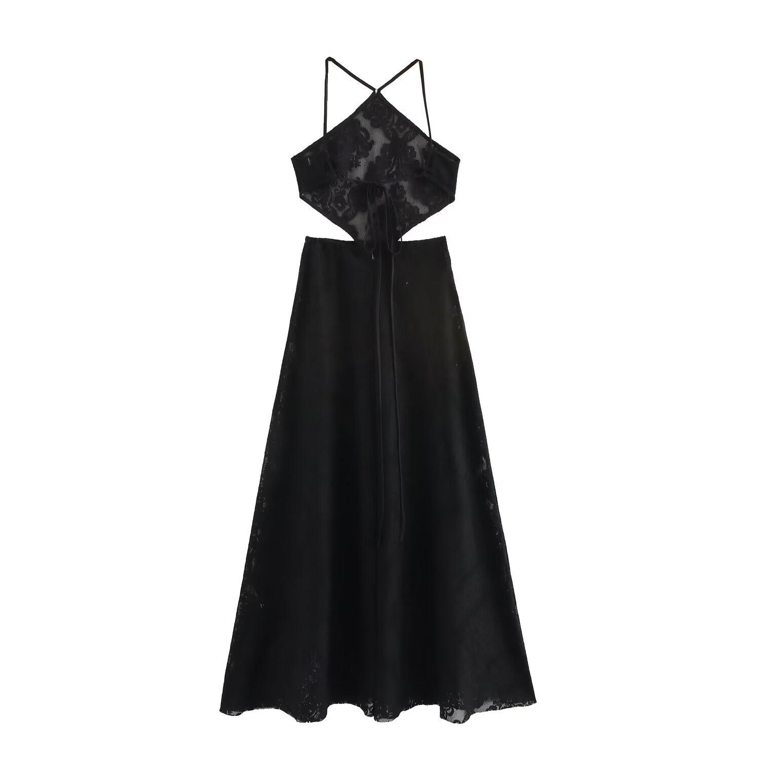 Весна 2025 Женское Европейское и Американское Длинное Платье на Бретелях-Спагетти с Ажурным Вырезом M чёрный