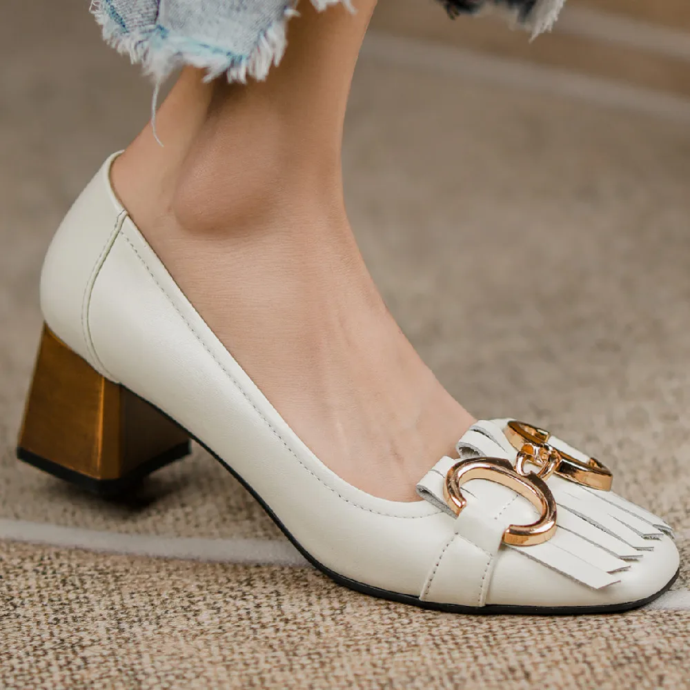 Women's genuine leather thick high heel square toe slip-on pumps OL style fringe metal decoration OL style comfort heels shoes
