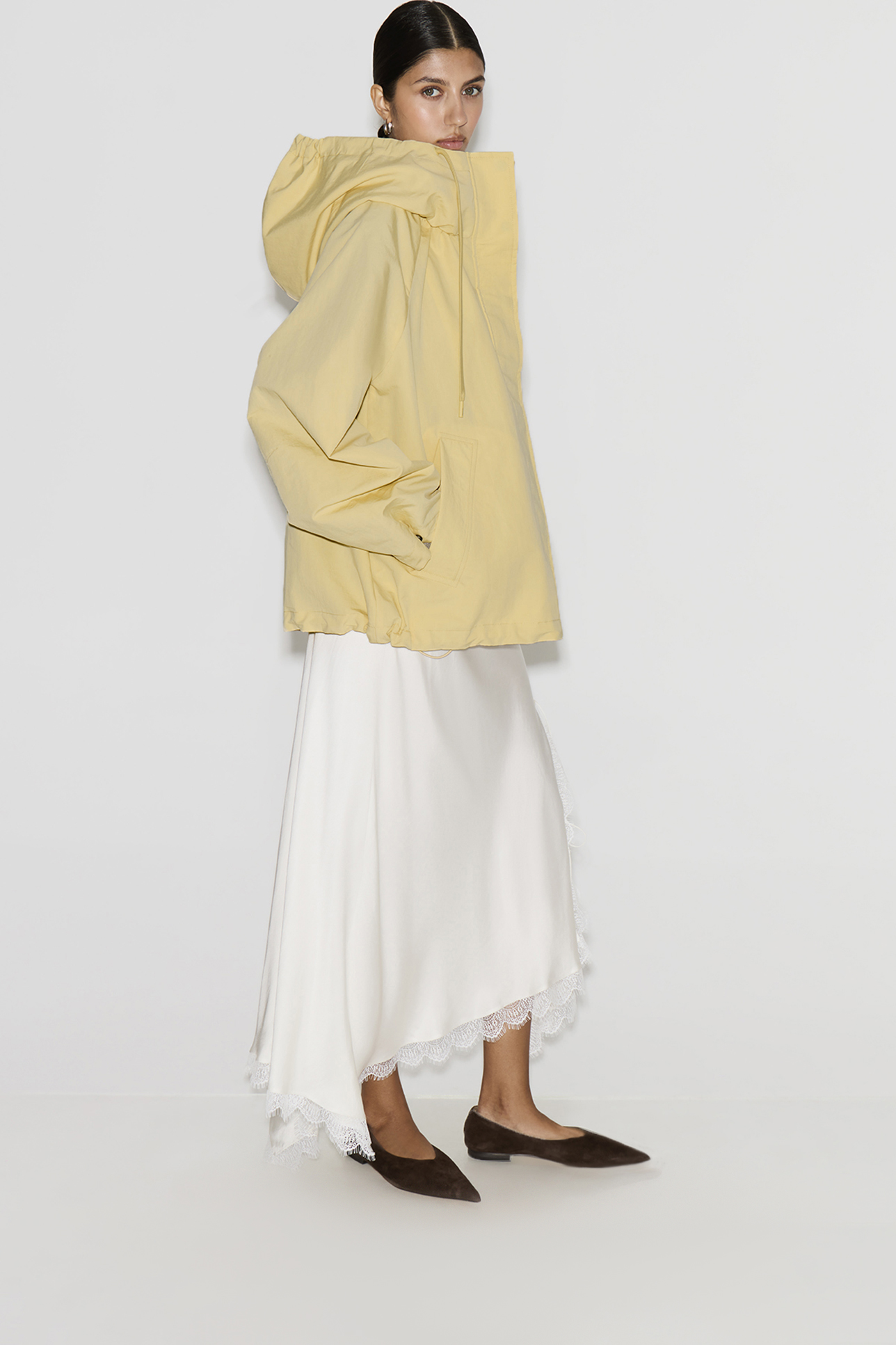 Укороченная ветровка с рукавом реглан и капюшоном. Застежка на молнию, которая закрыта планкой. Два прорезных кармана. По низу рукавов регулировка ширины с помощью кнопки и утяжка по низу изделия. Выполнена из смесовой фактурной ткани хлопок с нейлоном и имеет легкий жатый эффект. В ткани нет мембраны и водоотталкивающих свойств, не рекомендуем носить во время сильного дождя.