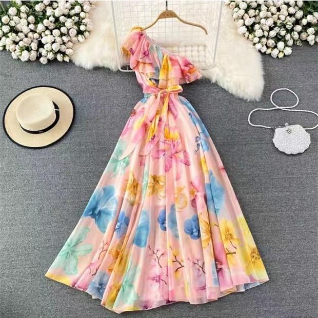 Вечернее платье женское милое шифоновое праздничное длинное платье с рюшами и косым воротником с открытыми плечами для женщин XXL розовый