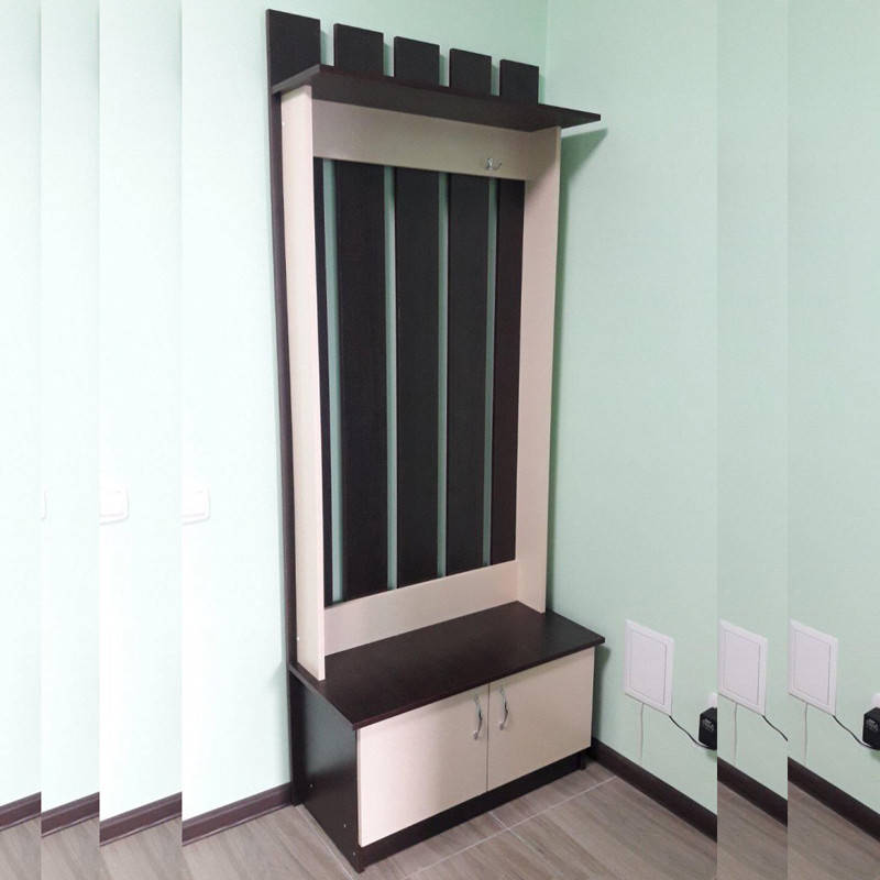 Вешалка Яна на задней решетчатой стенке имеет полку для головных уборов. Под полкой на сплошной планке располагаются двойные крючки для верхней одежды. В нижней части прихожей имеется тумба под обувь с распашными дверками, на дверках установлены удобные металлические ручки. Верхняя крышка тумбы может быть использована как сиденье. Добавьте мягкую интерьерную подушку, и обуваться будет гораздо удобнее, и внешний вид интерьера преобразится.