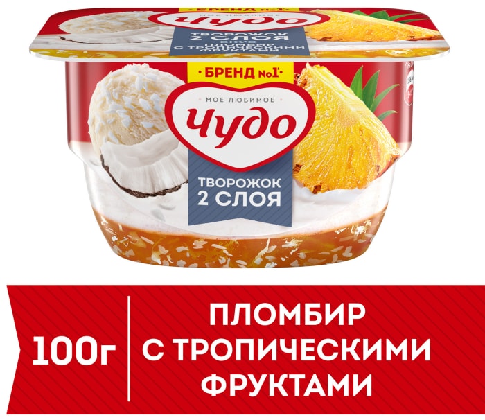 Взбитый двухслойный творожок Чудо, со вкусом пломбира с тропическими фруктами, 4.4%, 100 г