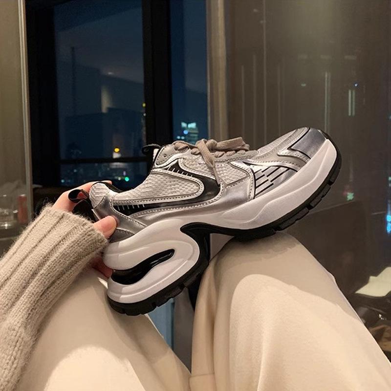Виноградная мать та же летняя модная повседневная спортивная обувь на шнуровке с дышащей сеткой на толстой подошве, увеличивающая рост папы обувь для женщин 40 серебряный