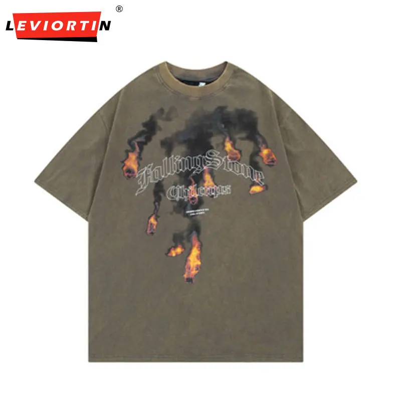 Винтажная Мужская футболка в стиле хип-хоп с надписями «камень пламени», «панк», «готика», «помытая» футболка, уличная одежда 2023, Harajuku, Модна...