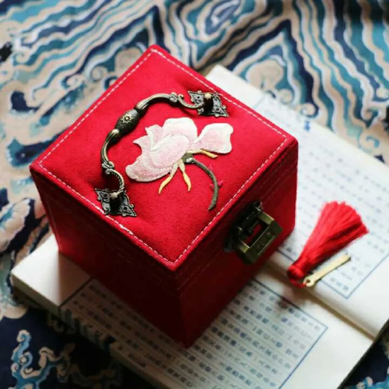 Винтажная бархатная шкатулка для ювелирных изделий в китайском стиле с вышитыми цветами и металлическими ручками, модная коробка для хранения серег, ожерелий