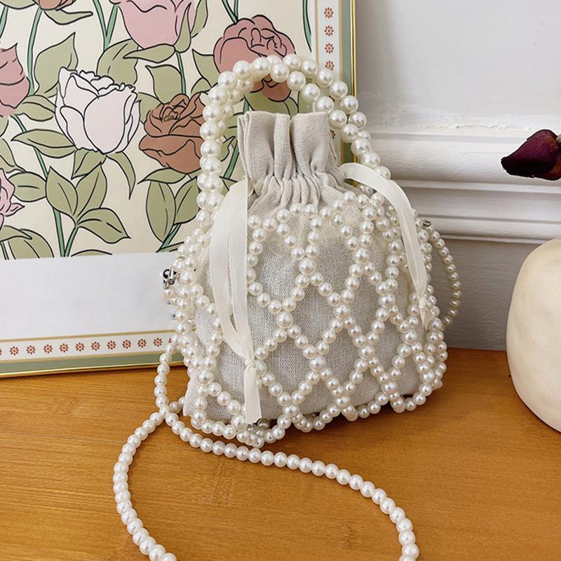 Винтажная женская сумка с ручкой сверху и жемчугом, летняя ажурная пляжная сумка-ведро для девочек через плечо 15*13cm белый