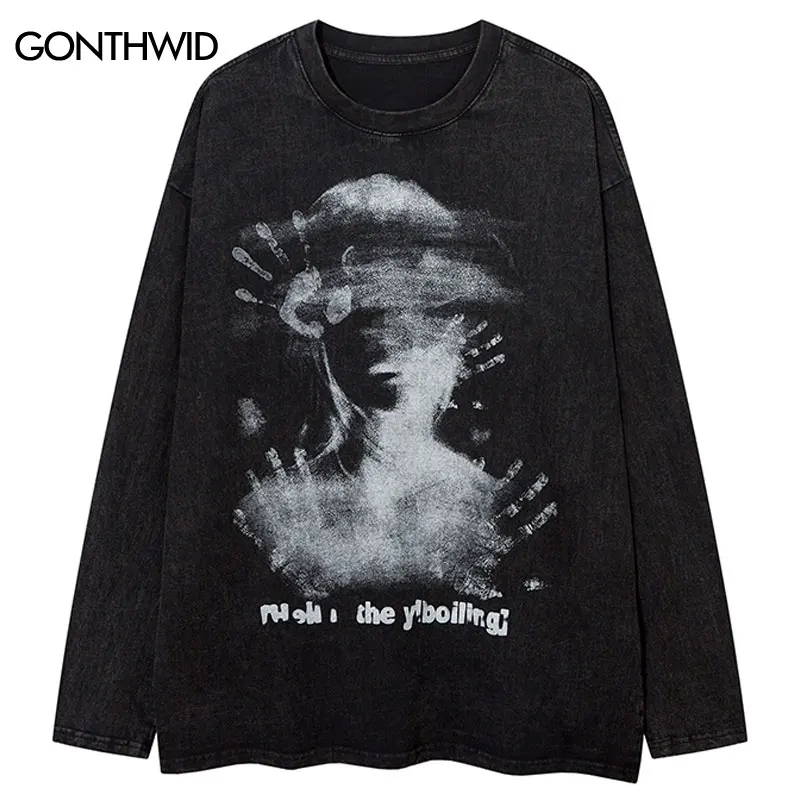 Винтажная футболка в стиле хип-хоп, с рисунком теней рук, женская футболка с длинным рукавом в стиле Панк Harajuku, большие размеры, 2023, модная свободная футболка