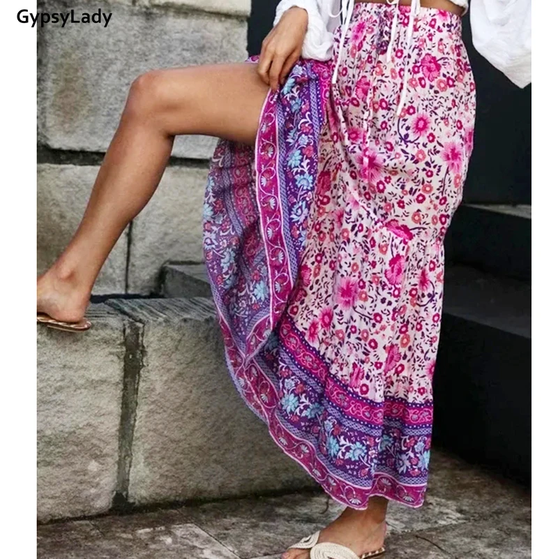 Винтажная юбка-макси GypsyLady, фиолетовые Цветочные Летние юбки в стиле бохо, женские повседневные Шикарные Длинные юбки с эластичным поясом и ...