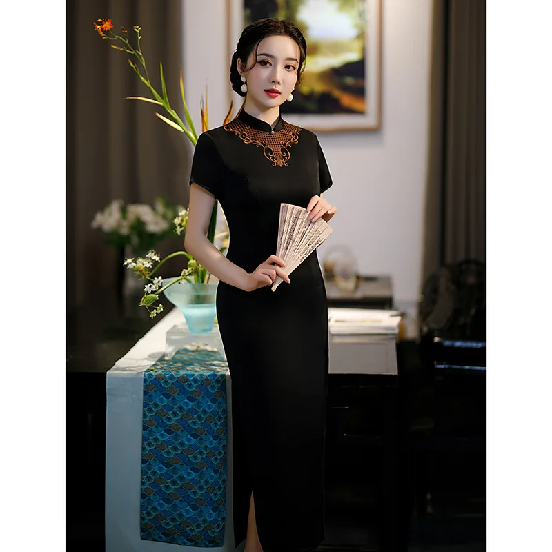 Винтажное однотонное длинное женское атласное платье-Ципао на пуговицах с вышивкой, облегающее сексуальное новое вечернее платье Qipao с вор...