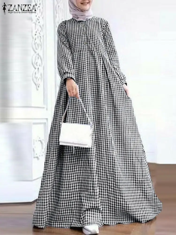 Винтажное платье в клетку в мусульманском стиле ZANZEA, весенний клетчатый сарафан, Турция, Дубай, Abaya, женское длинное платье макси, кафтан