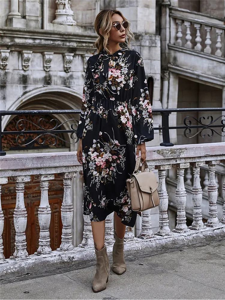 Винтажное черное платье-макси с цветочным принтом, вечерние платья в стиле бохо с длинным рукавом, женские шифоновые платья свободного кроя...
