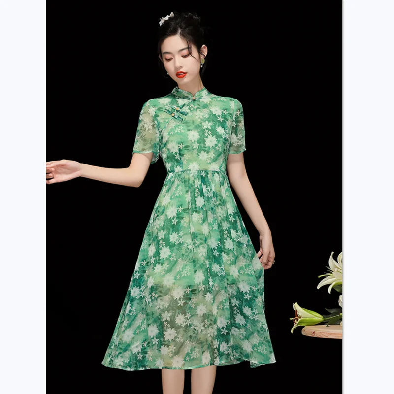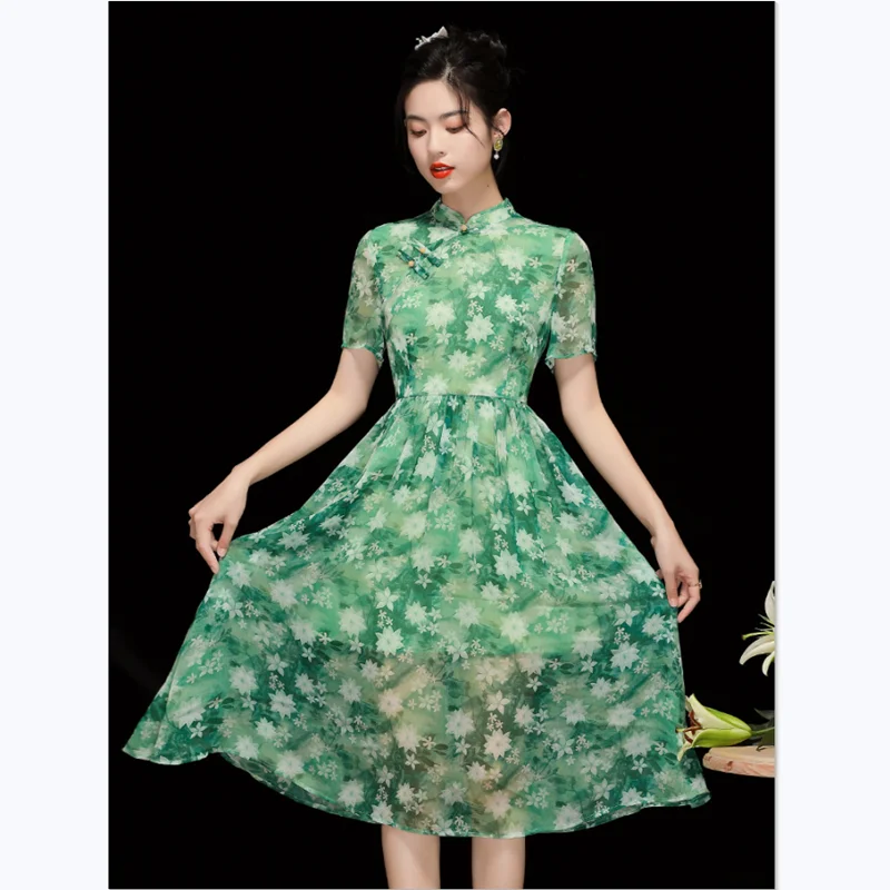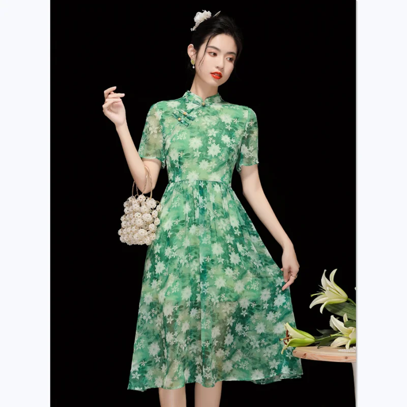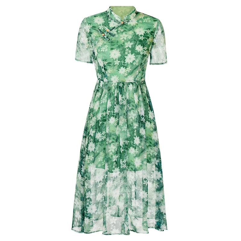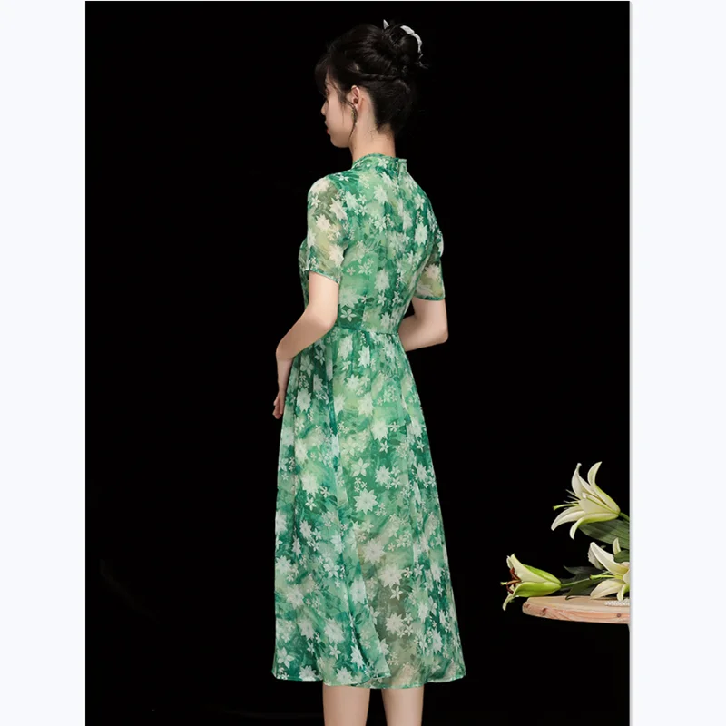 Винтажное шифоновое платье с коротким рукавом и воротником-стойкой
